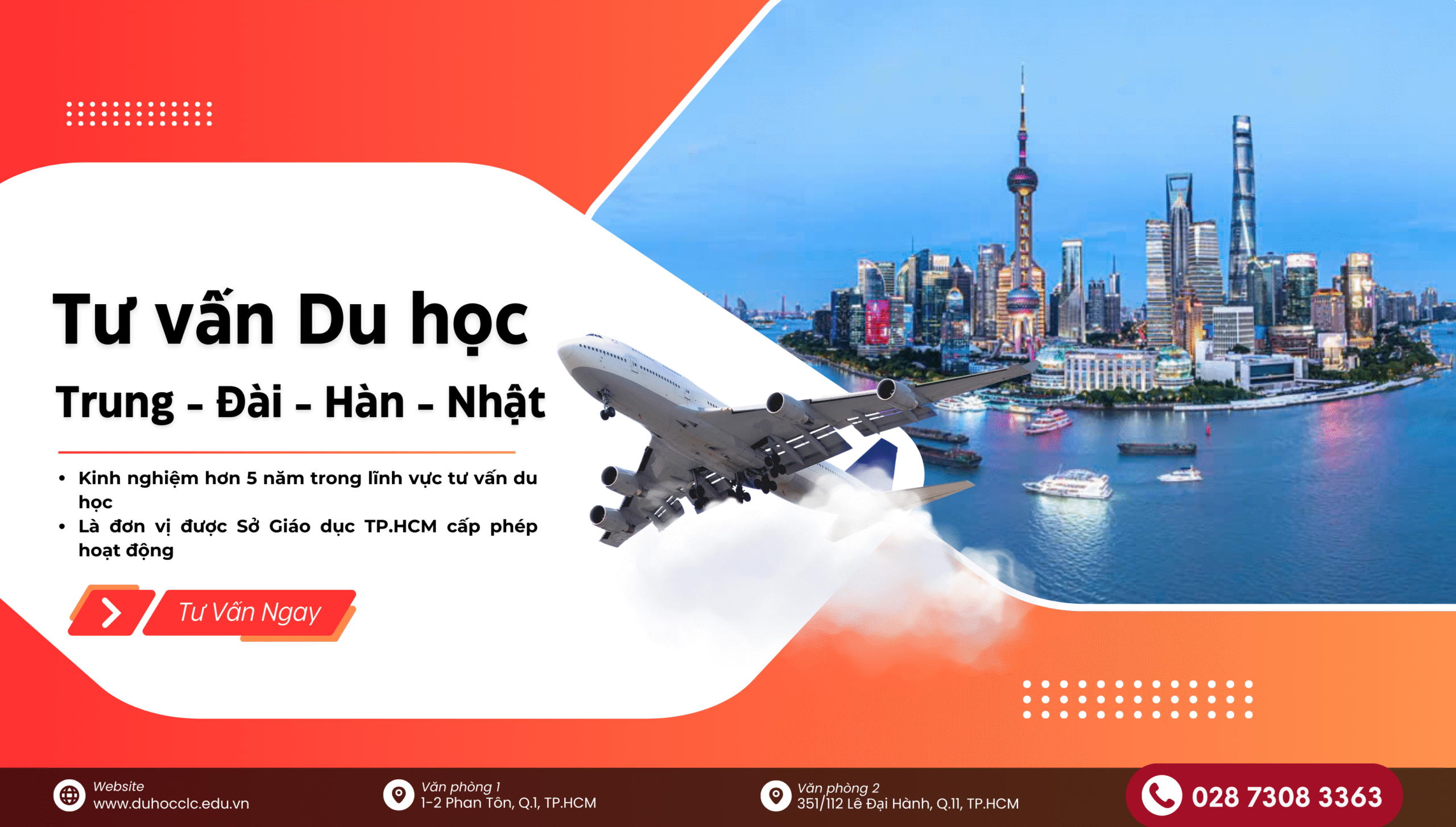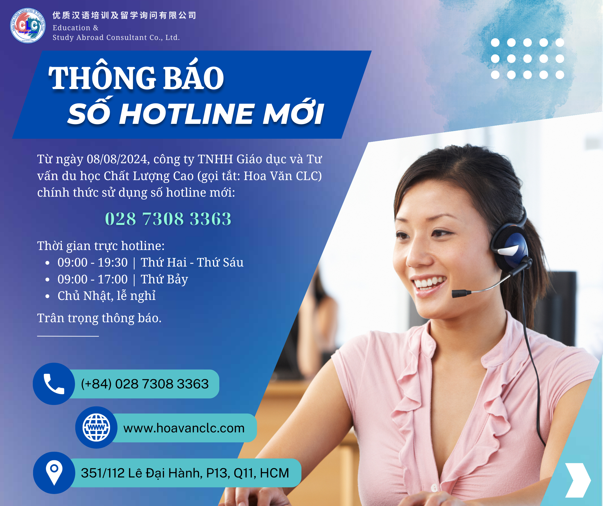 Công ty TNHH Giáo dục và Tư vấn Du học Chất Lượng Cao (gọi tắt là Du học CLC) ra đời từ năm 2019, với sự tâm huyết đội ngũ giáo viên tiếng Hoa nhiều năm kinh nghiệm cùng với đội ngũ chuyên viên tư vấn giỏi trong lĩnh vực du học Trung Quốc, Đài Loan.