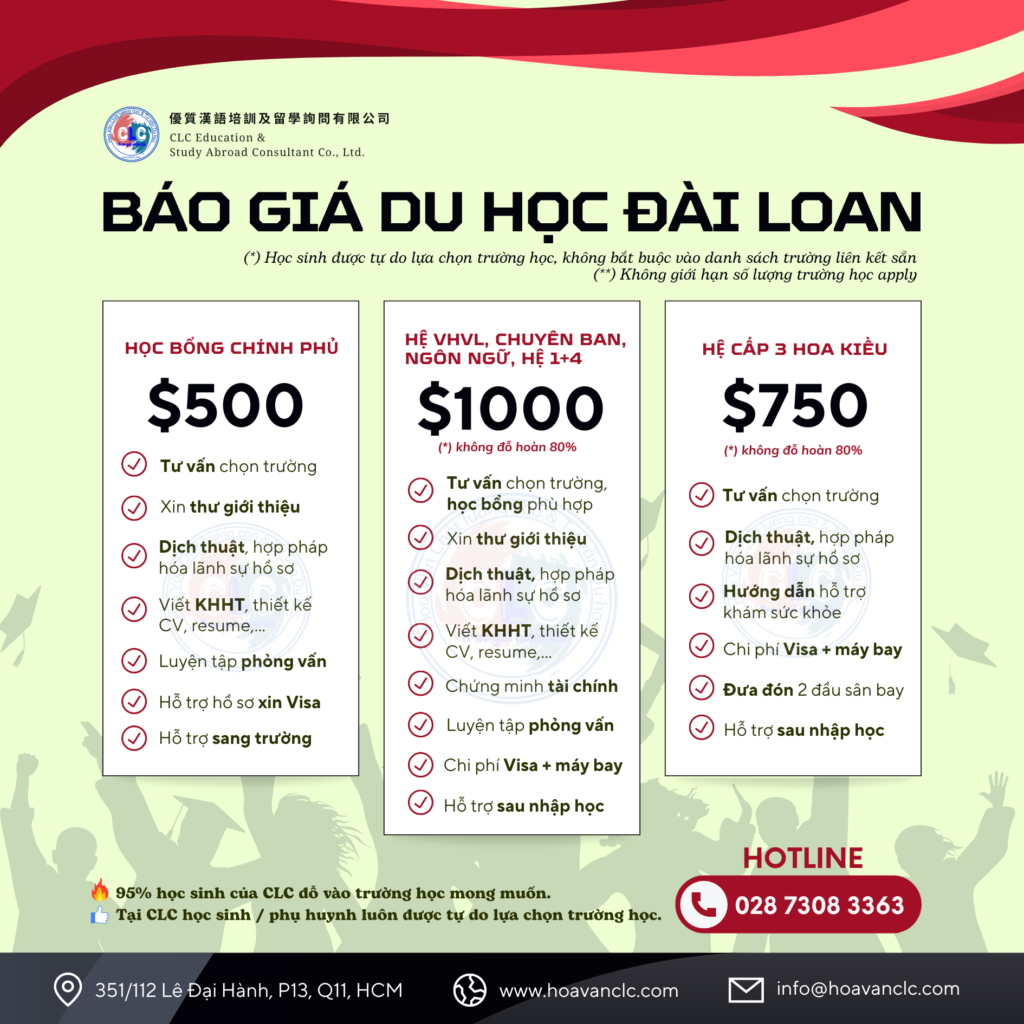 Bảng giá dịch vụ du học Đài Loan tại CLC liệt kê rõ từng khoản mục dịch vụ mà các bạn được hưởng.