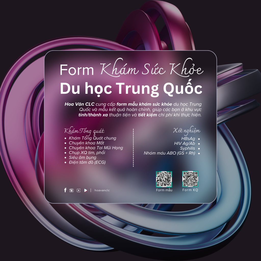 Nay Hoa Văn CLC cung cấp đầy đủ cho các bạn form mẫu giấy khám sức khỏe chuẩn (dùng để du học Trung Quốc), gửi kèm cả form đã thực hiện hoàn chỉnh (Quét mã QR trong hình để xem), cũng như các hạng mục thăm khám, xét nghiệm cần thực hiện tại bệnh viện.