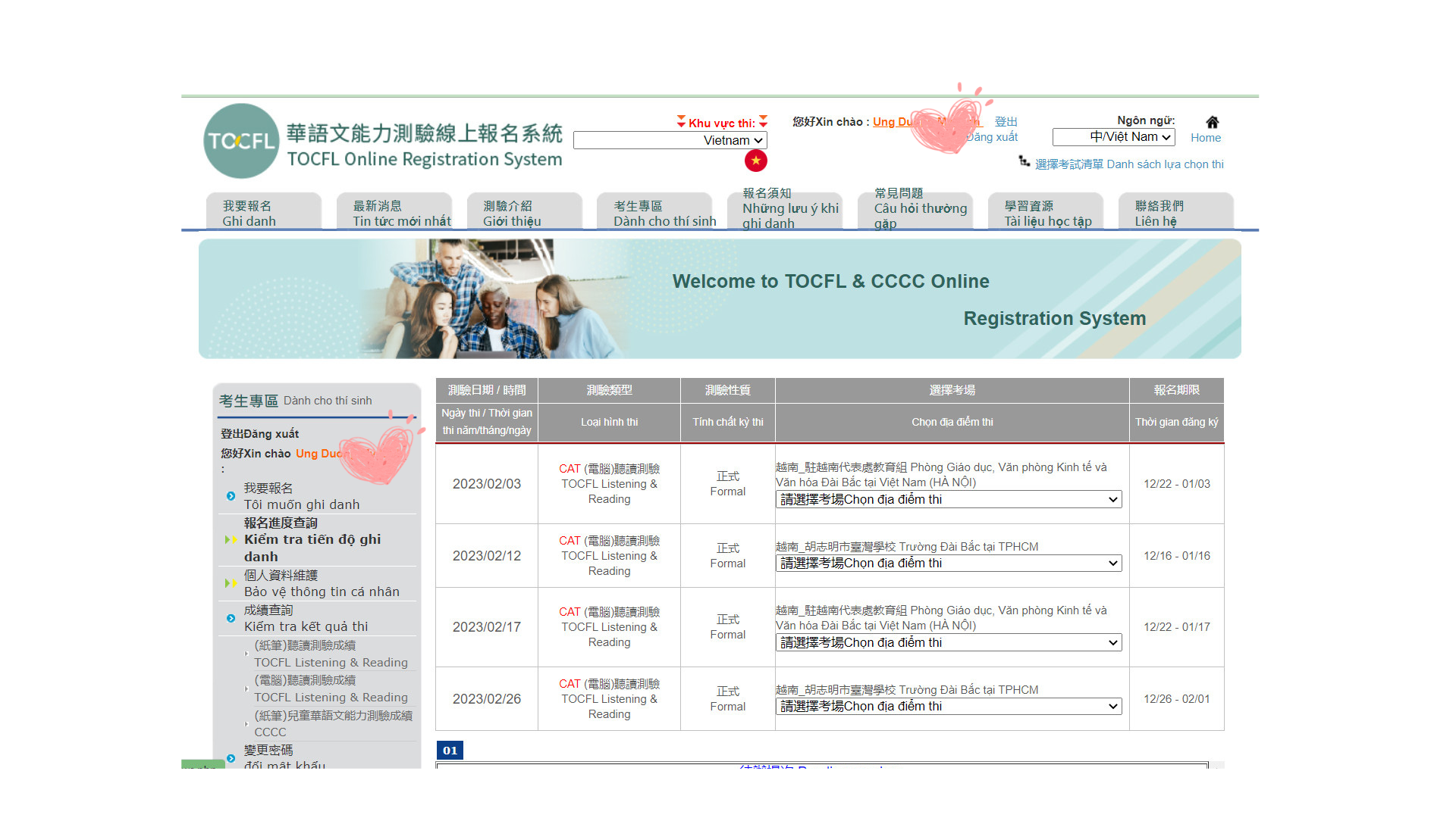 Hệ thống đã mở đăng ký thi (cả Giản thể và Phồn thể). CLC hiện đang đăng ký và chuẩn bị đi nộp tiền cho các học sinh của mình.