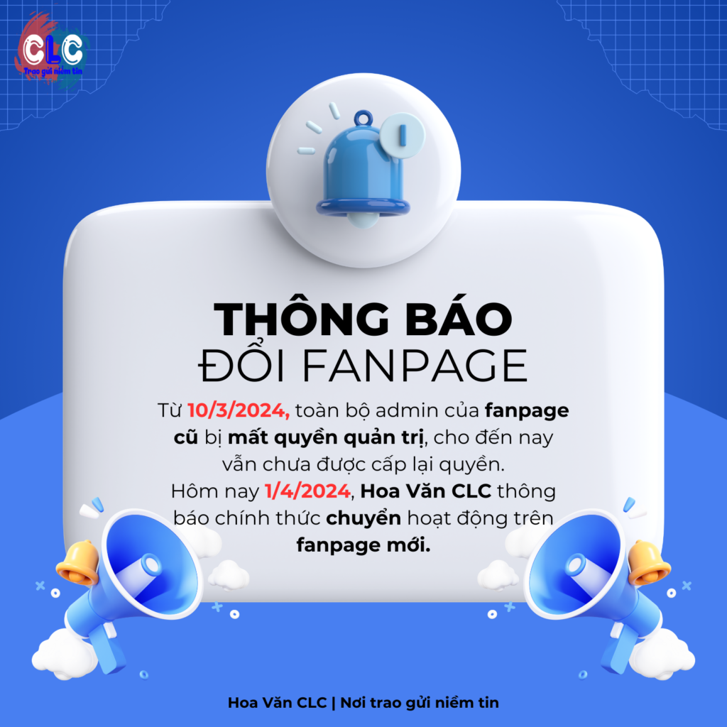 Hôm nay, 1/4/2024, Hoa Văn CLC chính thức thông báo chuyển hoạt động sang Fanpage mới, đồng thời gửi lời thứ lỗi đến Quý vị PH, các em HS, Quý đối tác nếu trong thời gian qua có liên hệ qua Fanpage cũ đến nay vẫn chưa thấy phản hồi.