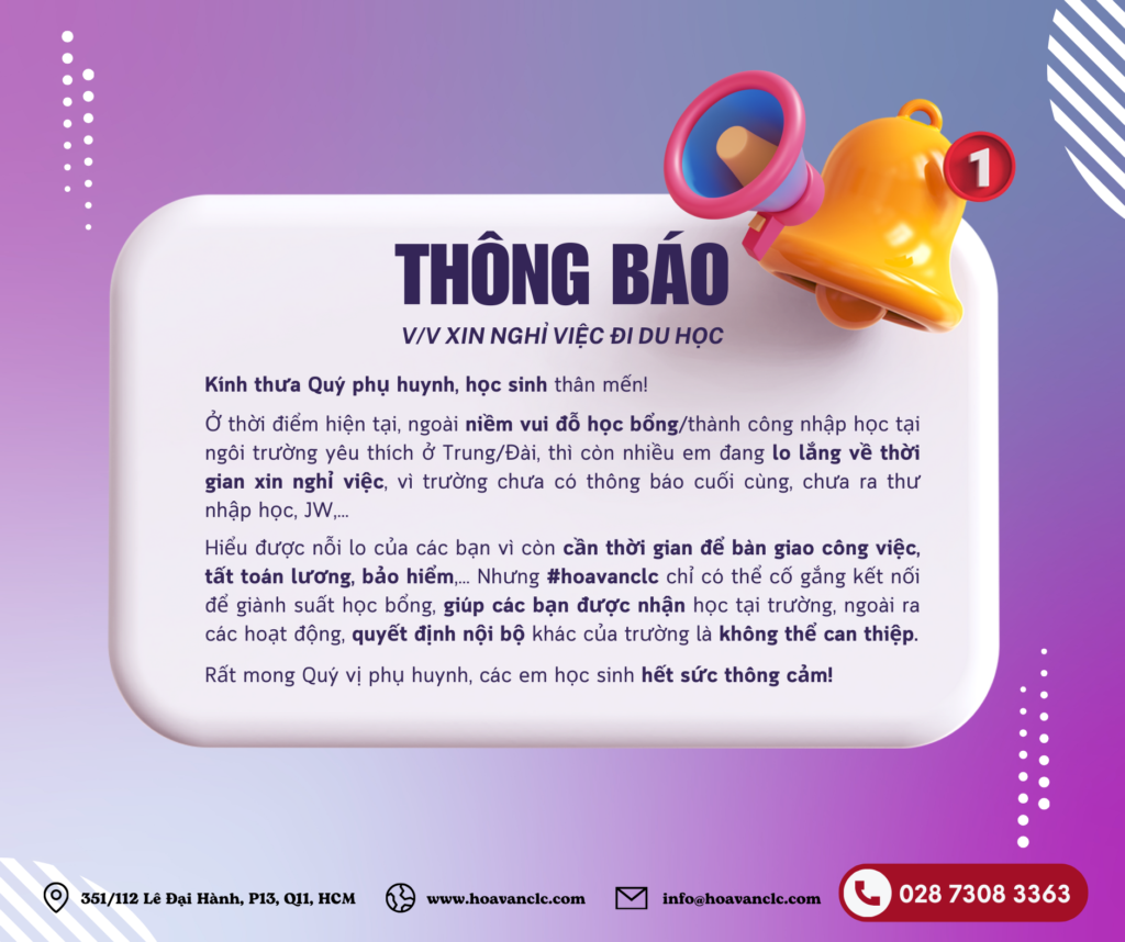 #hoavanclc sẽ cố gắng đảm bảo mọi điều khoản như thỏa thuận trong hợp đồng hoặc những gì đã trao đổi đồng thuận giữa 2 bên, ngoài ra quyết định cuối cùng của bên thứ 3 – trường học là quyết định khách quan, không thể can thiệp 100%, nên mong Quý vị hết sức thông cảm.