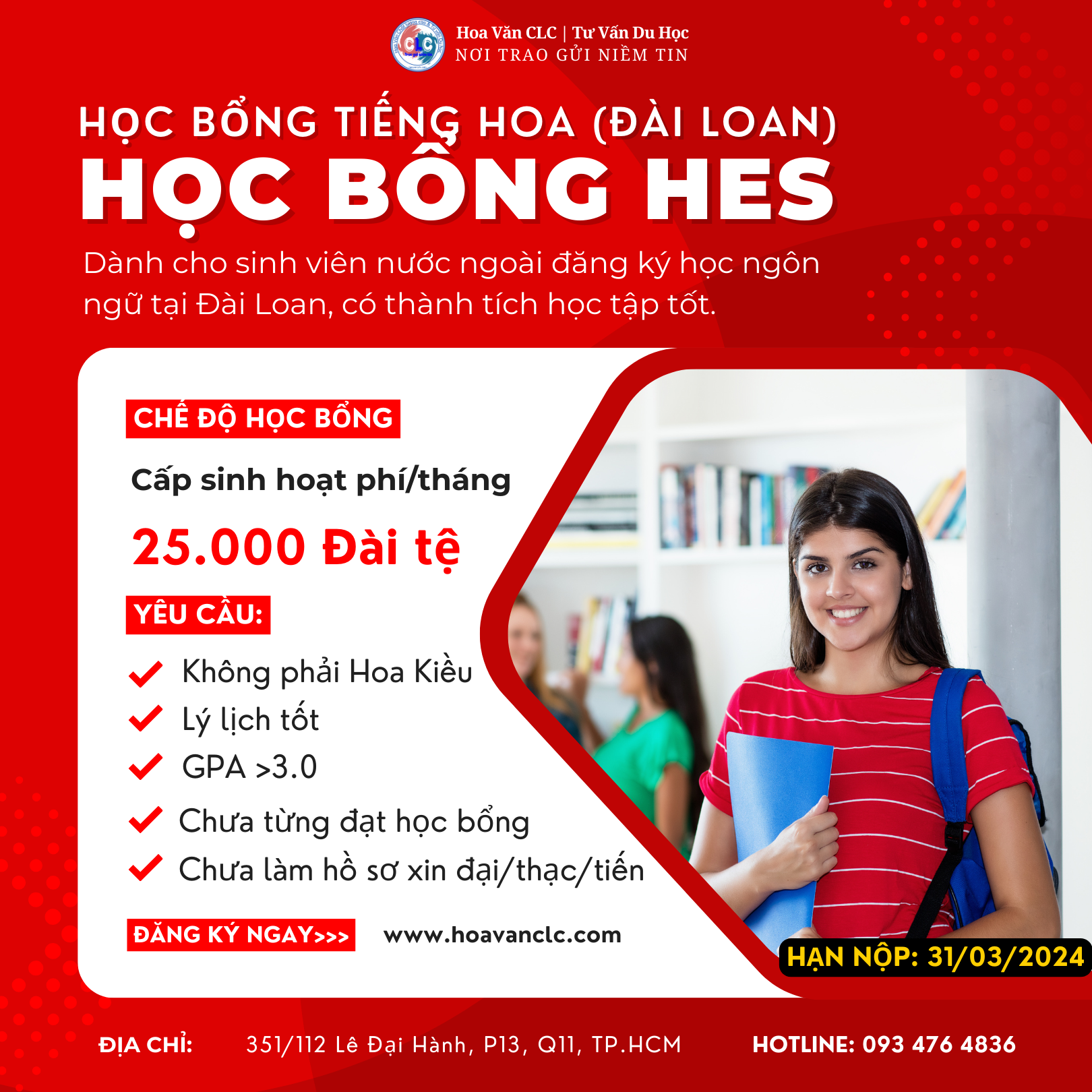 Công ty TNHH Giáo dục và Tư vấn Du học Chất Lượng Cao (gọi tắt là Du học CLC) ra đời từ năm 2019, với sự tâm huyết đội ngũ giáo viên tiếng Hoa nhiều năm kinh nghiệm cùng với đội ngũ chuyên viên tư vấn giỏi trong lĩnh vực du học Trung Quốc, Đài Loan.
